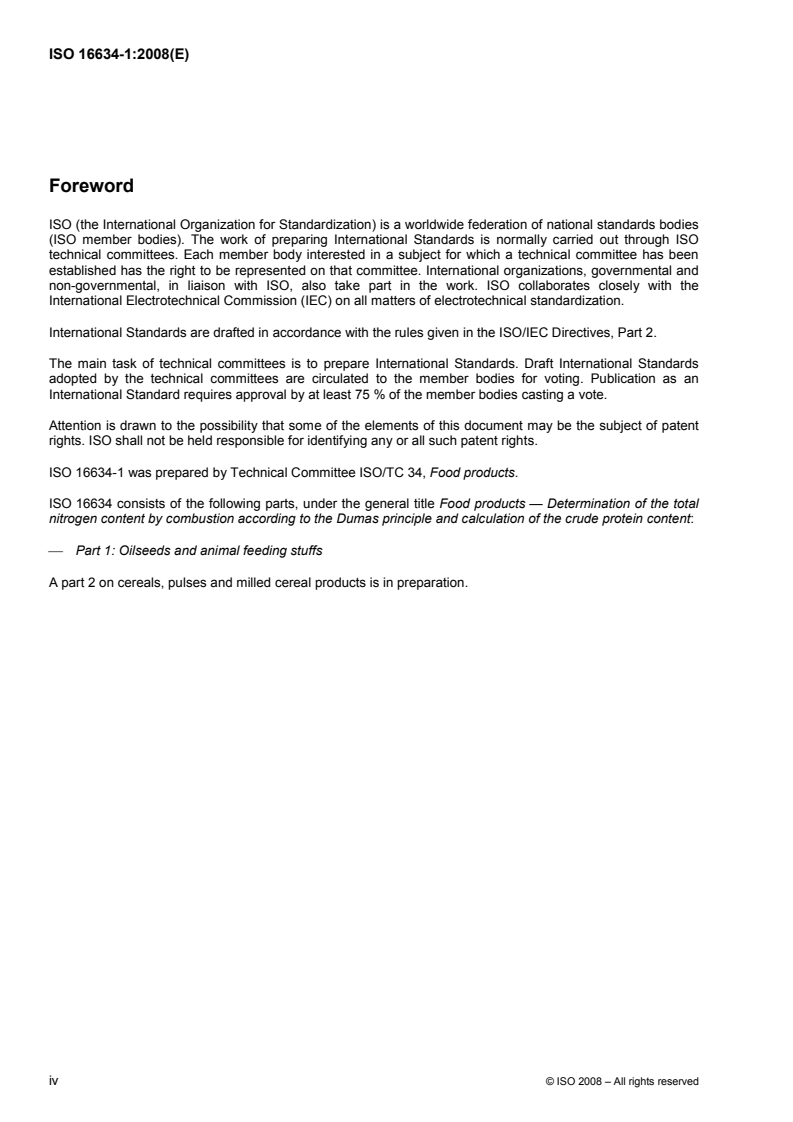 ISO 16634-1:2008 - Food products - Determination of the total nitrogen content by combustion according to the Dumas principle and calculation of the crude protein content — Part 1: Oilseeds and animal feeding stuffs Released:22. 10. 2008