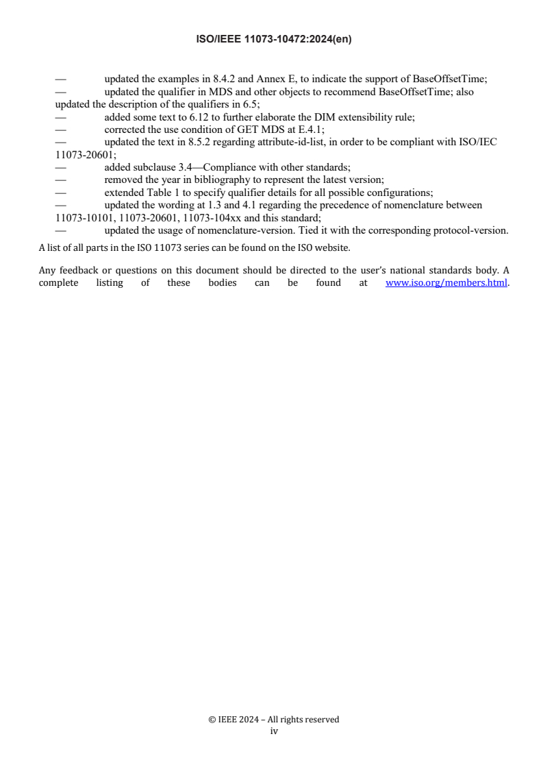 The ISO/IEEE 11073-10472:2024 standard encompasses crucial aspects of health informatics, particularly focusing on device interoperability and communication within the realm of personal health devices, specifically medication monitors. Its primary objective is to establish a normative framework that enhances the interaction between medication monitoring devices and various management systems, such as personal health appliances, smartphones, and computers. One of the strengths of this standard lies in its commitment to plug-and-play interoperability. By defining clear communication protocols and utilizing existing standards, the document effectively streamlines the integration of medication monitors into diverse telehealth environments. This robust approach minimizes ambiguity by specifying consistent term codes, data formats, and behaviors that promote seamless interaction between devices and managers. Moreover, the relevance of ISO/IEEE 11073-10472:2024 extends into the growing landscape of telehealth, where the need for reliable communication and adherence tracking is increasingly paramount. The standard’s focus on medication monitors ensures that clinicians and patients can rely on accurate assessments of medication adherence, contributing to improved health outcomes. In conclusion, ISO/IEEE 11073-10472:2024 sets a significant precedent in health informatics standards by enhancing device communication and interoperability, thereby benefiting stakeholders in the telehealth ecosystem. Its ability to leverage established terminologies and frameworks adds considerable value to the standard, positioning it as a vital resource for current and future applications in personal health device communication.