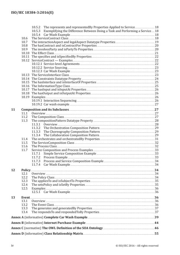 The standard organizes SOA concepts as classes, properties and datatype attributes and includes normative and informative material (examples and OWL definitions). Major technical topics include: