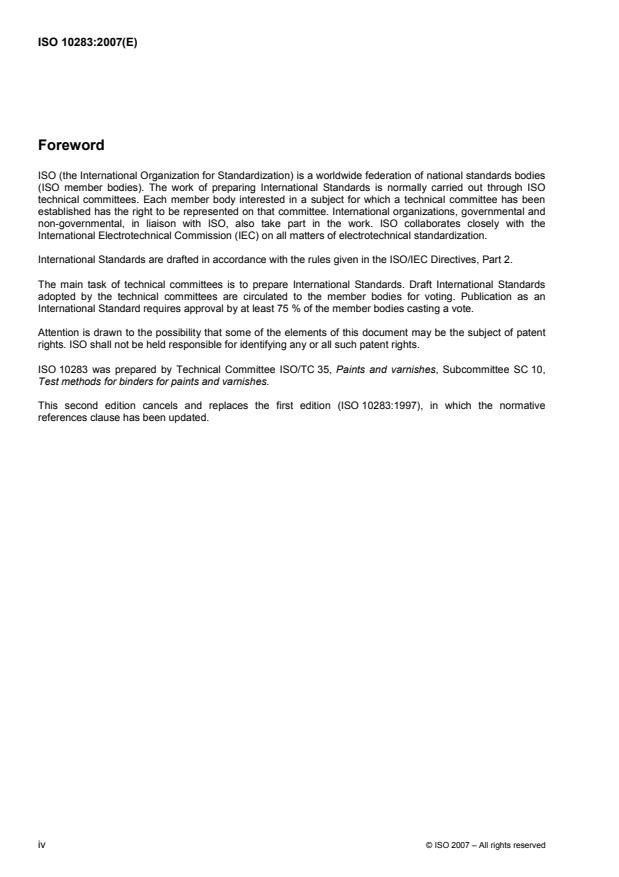 ISO 10283:2007 is a standard published by the International Organization for Standardization (ISO). Its full title is "Binders for paints and varnishes - Determination of monomeric diisocyanates in isocyanate resins". This standard covers: ISO 10283:2007 specifies a gas-chromatographic method for determining monomeric diisocyanates such as toluene diisocyanate, hexamethylene diisocyanate, isophorone diisocyanate, diphenylmethane diisocyanate and other diisocyanates in isocyanate resins and in solutions prepared from such resins, insofar as these are used in the formulation of paints and similar coating materials.
