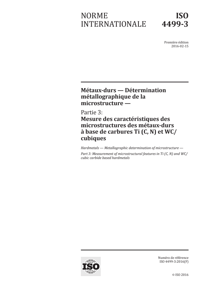 ISO 4499-3:2016 - Métaux-durs — Détermination métallographique de la microstructure — Partie 3: Mesure des caractéristiques des microstructures des métaux-durs à base de carbures Ti (C, N) et WC/cubiques/3/2016
