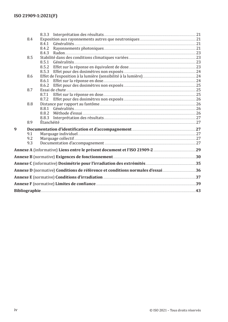 Le présent document fournit des exigences de fonctionnement et d’essai permettant de déterminer l’acceptabilité des systèmes dosimétriques pour les neutrons qui doivent être utilisés pour le mesurage de l’équivalent de dose individuel, Hp(10), dans une gamme d’énergies neutroniques s’étendant des énergies thermiques à 20 MeV. Le présent document s’applique à tous les détecteurs passifs de neutrons utilisables dans un dosimètre individuel dans une partie ou dans toute la gamme d’énergies neutroniques mentionnée ci-dessus. Dans la description des essais, aucune distinction n’est faite entre les différentes techniques disponibles sur le marché. Seules des distinctions générales, telles que dosimètres à usage unique ou réutilisables par exemple, sont prises en compte. Le présent document ne décrit que les essais de type. Les essais de type ont pour objet d’évaluer les caractéristiques de base des systèmes dosimétriques et ils sont souvent assurés par des laboratoires nationaux reconnus. Le présent document ne décrit pas d’essais de fonctionnement pour caractériser la dégradation induite par: — la variabilité temporelle intrinsèque de la qualité du dosimètre fourni par le fabricant; — la variabilité temporelle intrinsèque des traitements de préparation (avant l’irradiation et/ou avant la lecture), le cas échéant; — la variabilité temporelle intrinsèque du processus de lecture; — les effets environnementaux sur les traitements de préparation, le cas échéant; — les effets environnementaux sur le processus de lecture. L’Annexe C du présent document fournit des informations relatives à la dosimétrie aux extrémités, basées sur les recommandations données dans le Rapport 66 de l’ICRU. Le présent document traite uniquement de la surveillance de la dose individuelle neutron, et non des conditions d’accident de criticité. Les liens entre le présent document et l’ISO 21909-2 sont indiqués à l’Annexe A.