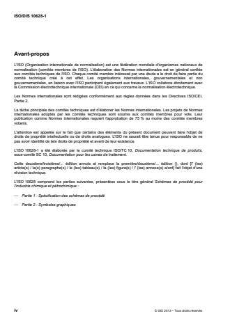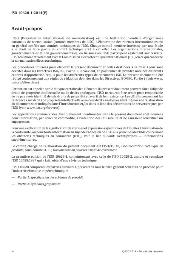 L'ISO 10628-1 :2014 spécifie la classification, le contenu et la représentation des schémas de procédé. Elle établit également des règles pour l'élaboration de schémas de procédé pour l'industrie chimique et pétrochimique. L'ISO 10628 n'est pas applicable aux schémas du domaine électrotechnique. L'ISO 10628-1 :2014 est une norme d'application collective de l'ISO 15519.
