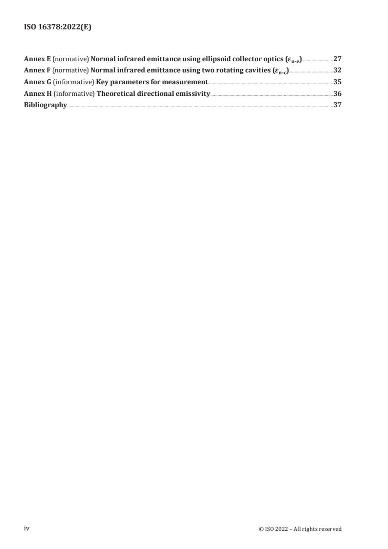 - Infrared emittance - hemispherical thermal method (εh‑t, Annex C) and normal emittance methods using an IR spectrometer (εn‑s, Annex D), ellipsoid collector optics (εn‑e, Annex E), and two rotating cavities (εn‑c, Annex F).