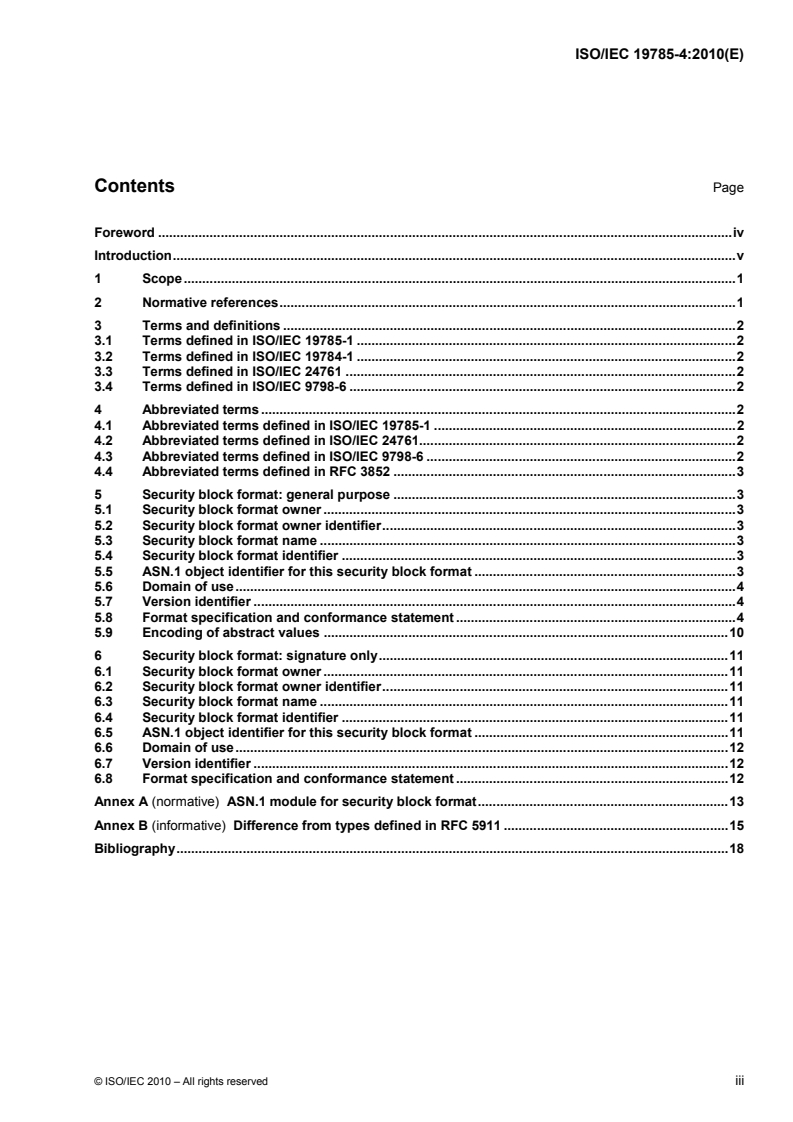 - References include ISO/IEC 19785-1/2, ISO/IEC 24761, RFC 3852 (CMS), RFC 5911, and ASN.1 encoding standards.