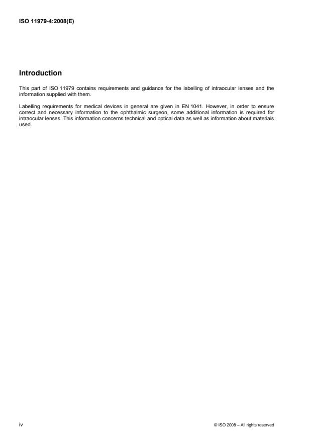 ISO 11979-4:2008 is a standard published by the International Organization for Standardization (ISO). Its full title is "Ophthalmic implants - Intraocular lenses - Part 4: Labelling and information". This standard covers: ISO 11979-4:2008 specifies the labelling requirements for intraocular lenses (IOLs) and the information to be provided within or on the packaging.