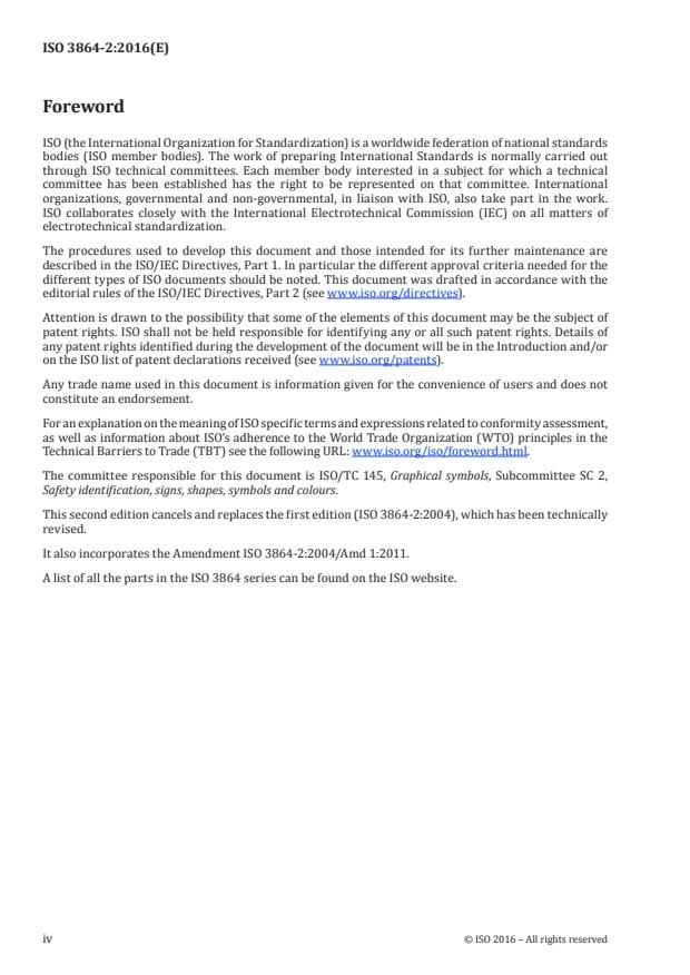 ISO 3864-2:2016 is a standard published by the International Organization for Standardization (ISO). Its full title is "Graphical symbols - Safety colours and safety signs - Part 2: Design principles for product safety labels". This standard covers: ISO 3864-2:2016 establishes additional principles to ISO 3864‑1 for the design of safety labels for products, i.e. any items manufactured and offered for sale in the normal course of commerce, including but not limited to consumer products and industrial equipment. The purpose of a product safety label is to alert persons to a specific hazard and to identify how the hazard can be avoided. ISO 3864-2:2016 is applicable to all products in all industries where safety-related questions can be posed. However, it is not applicable to safety labels used - for chemicals, - for the transport of dangerous substances and preparations and - in those sectors subject to legal regulations which differ from certain provisions of this document. The design principles incorporated in this document are intended to be used by all ISO Technical Committees and anyone designing product safety labels in the development of product safety label standards for their industries or services.