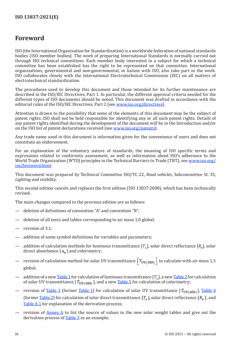 ISO 13837:2021 is a standard published by the International Organization for Standardization (ISO). Its full title is "Road vehicles - Safety glazing materials - Method for the determination of solar transmittance". This standard covers: This document specifies test methods to determine the luminous, the direct and total solar transmittance, and the colorimetry of safety glazing materials for road vehicles. This document applies to monolithic or laminated, clear or tinted samples of safety glazing materials. Essentially flat sections of glazing parts can be used in this test, as well as flat samples of the same materials.