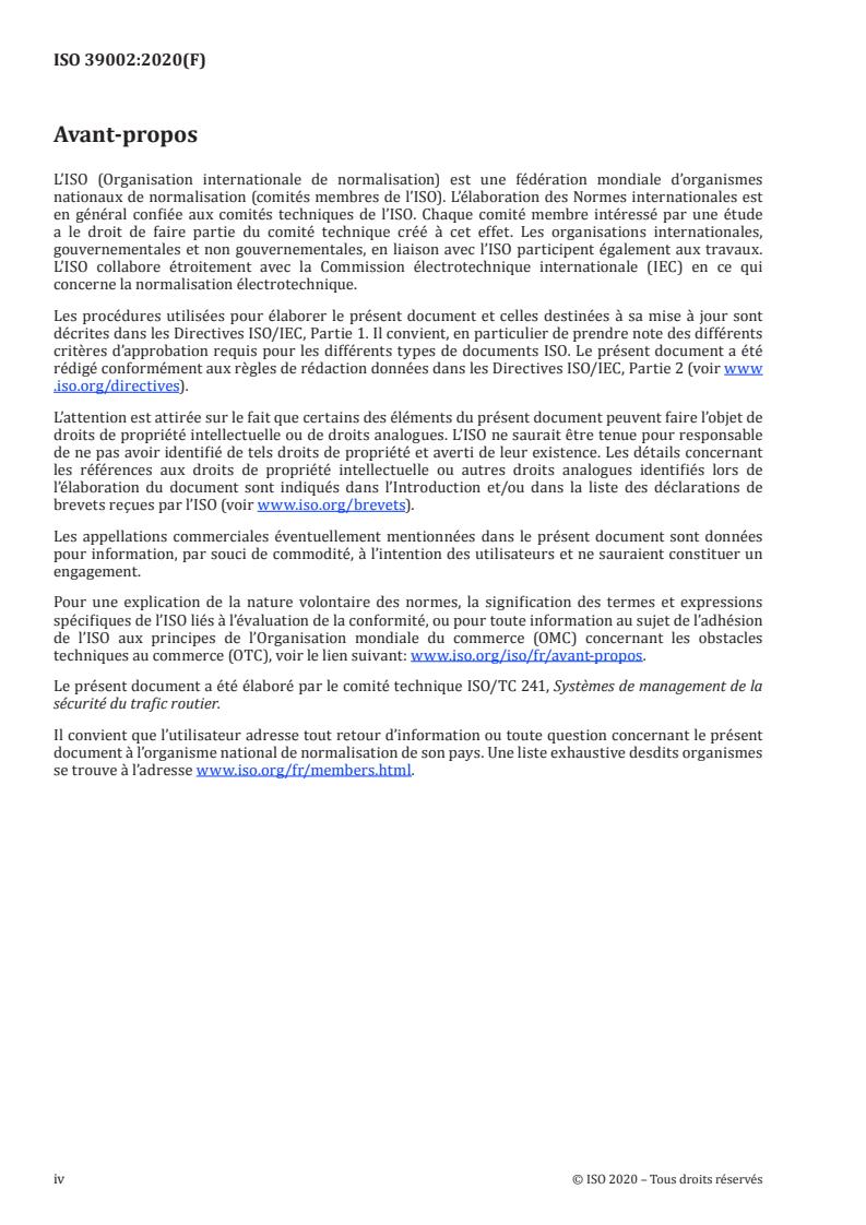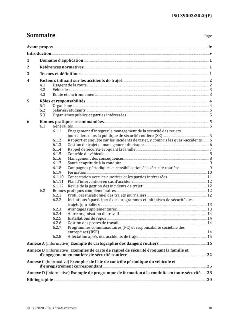 ISO 39002:2020 - Sécurité routiere -- Bonnes pratiques pour la mise en ouvre du management de la sécurité des trajets journaliers