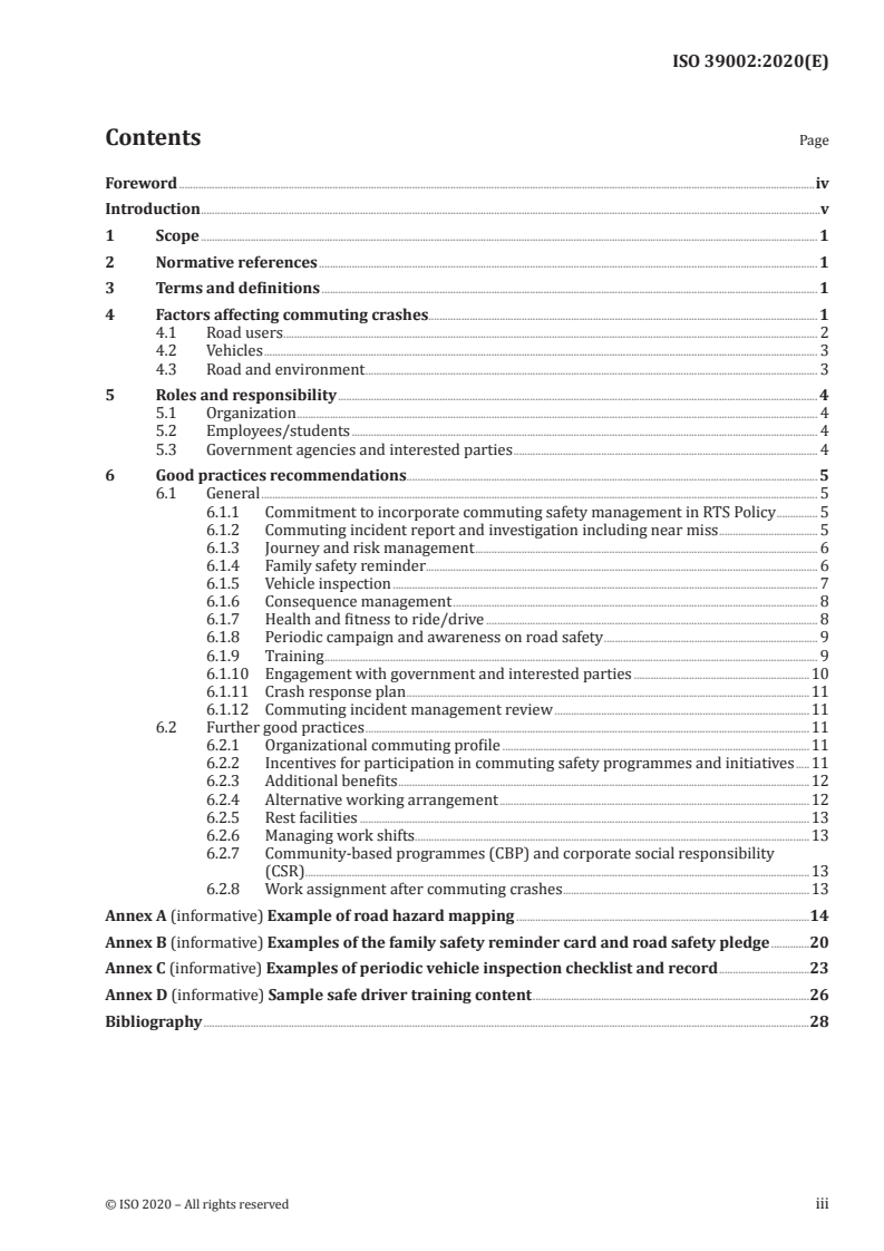 This document provides guidelines for good practices that can be adopted by organizations for the implementation of commuting safety management. These practices are intended to reduce the number of fatalities and serious injuries, the severity of injuries, and further to minimize damage to property and economic loss due to road crashes. This document is applicable to any organization to help it protect commuters including vulnerable road users (VRU) through the adoption of a proactive approach to manage commuting risks. This document is also applicable to commercial transport organizations including fleet operators, as well as schools.