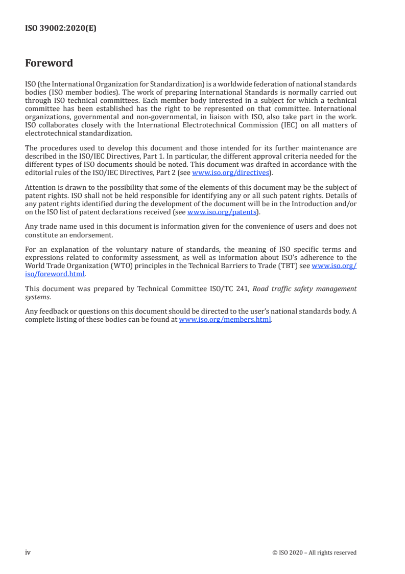 ISO 39002:2020 is a standard published by the International Organization for Standardization (ISO). Its full title is "Road traffic safety — Good practices for implementing commuting safety management". This standard covers: This document provides guidelines for good practices that can be adopted by organizations for the implementation of commuting safety management. These practices are intended to reduce the number of fatalities and serious injuries, the severity of injuries, and further to minimize damage to property and economic loss due to road crashes. This document is applicable to any organization to help it protect commuters including vulnerable road users (VRU) through the adoption of a proactive approach to manage commuting risks. This document is also applicable to commercial transport organizations including fleet operators, as well as schools.
