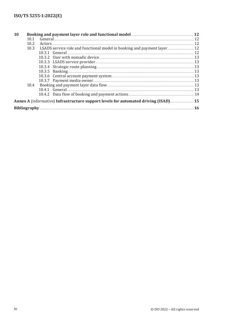 ISO/TS 5255-1:2022 is a technical specification published by the International Organization for Standardization (ISO). Its full title is "Intelligent transport systems - Low-speed automated driving system (LSADS) service - Part 1: Role and functional model". This standard covers: This document defines the requirements of the basic role and functional model of service applications for the introduction of low-speed automated driving system (LSADS) services including infrastructure facilities for supporting mobility in urban and rural areas. This document covers services using LSADS-equipped vehicles only; in-vehicle control systems are outside the scope. Examples of infrastructure facilities and road furniture include driving monitoring platforms, emergency response platforms, operation management platforms, user service platforms (e.g. for online reservations and online payments) and platforms for supporting automated driving systems.