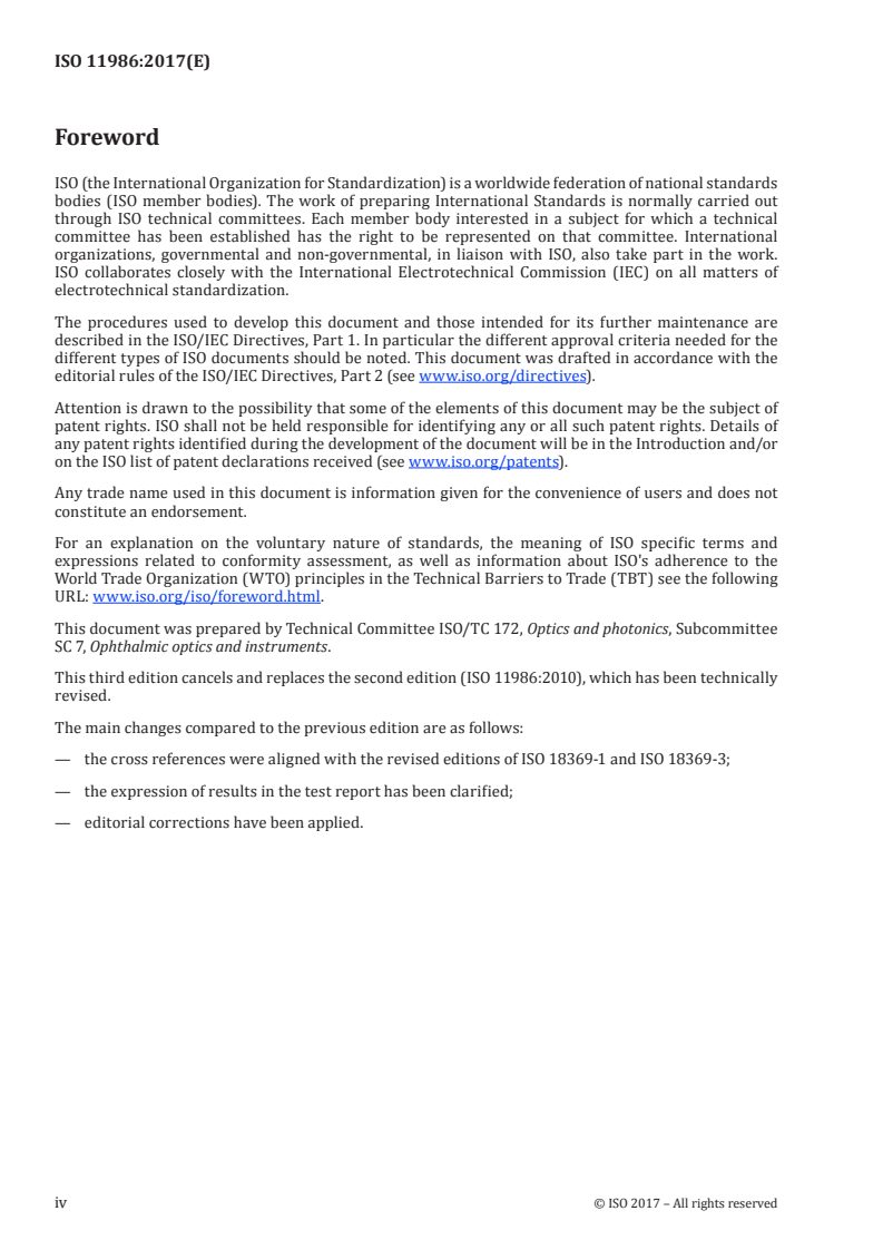 ISO 11986:2017 is a standard published by the International Organization for Standardization (ISO). Its full title is "Ophthalmic optics - Contact lenses and contact lens care products - Determination of preservative uptake and release". This standard covers: ISO 11986:2017 provides general procedures for the selection of methods, preparation of samples, and the conduct of testing for the uptake and release of preservatives from contact lenses. NOTE 1 Due to the manifest difficulties of reproducibility when coating contact lenses with mineral and organic deposits encountered during lens wear, these methods are only applicable to new and unused contact lenses. NOTE 2 Preservative depletion by a contact lens in the limited volume of a lens case could compromise disinfection performance. This document does not measure disinfection performance.