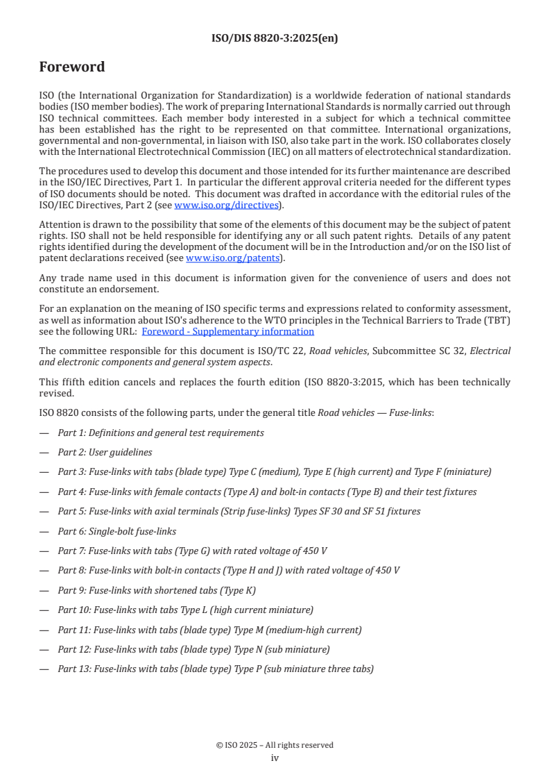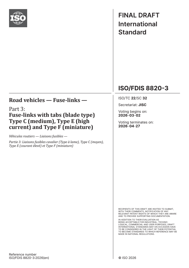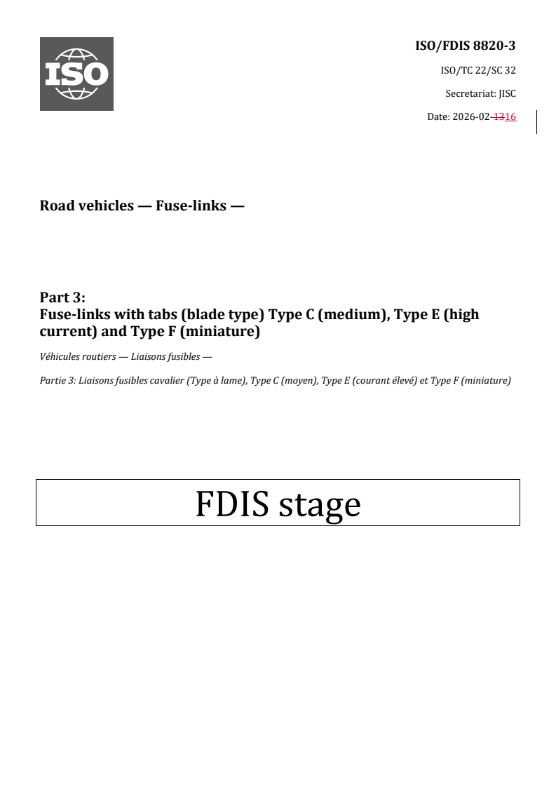 ISO/FDIS 8820-3 - Road vehicles — Fuse-links — Part 3: Fuse-links with tabs (blade type) Type C (medium), Type E (high current) and Type F (miniature)/2/2025