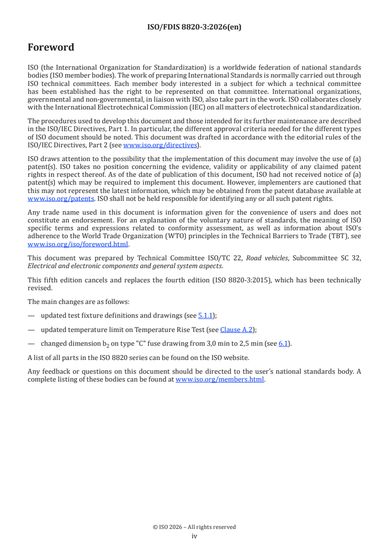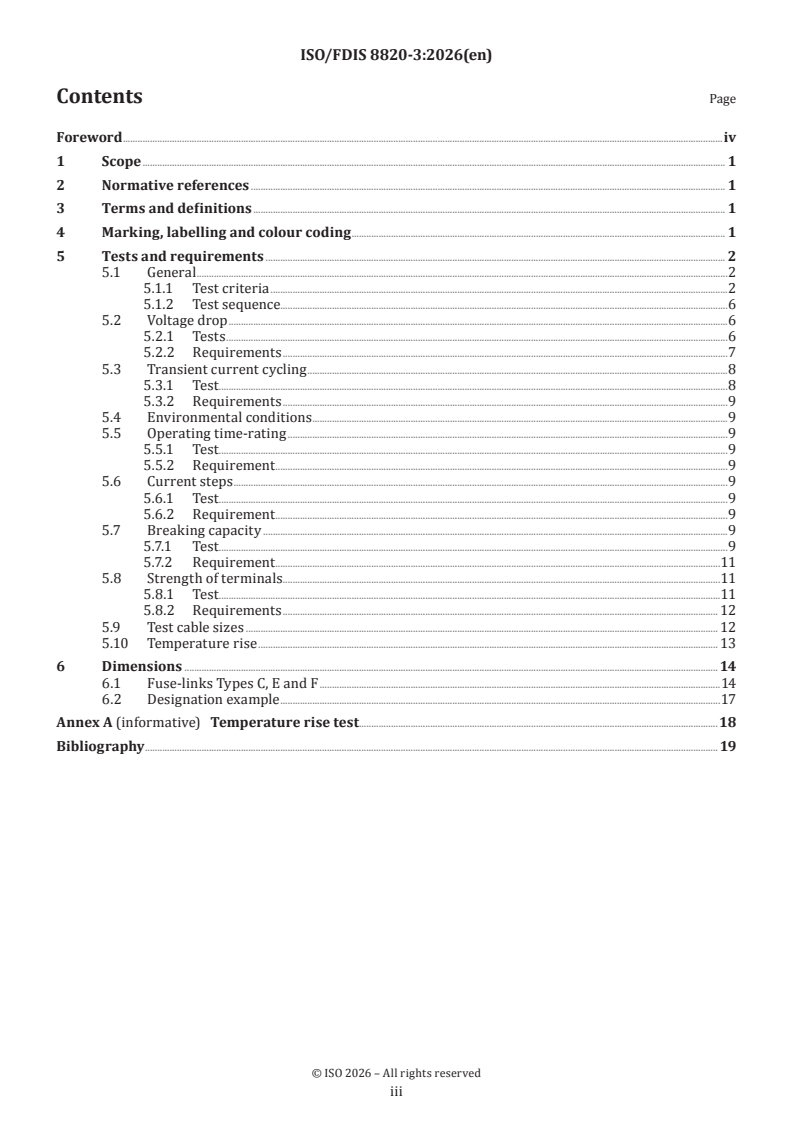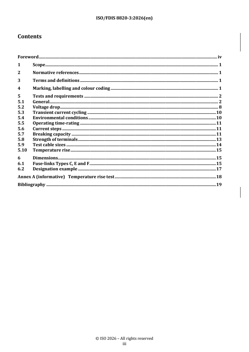 ISO/FDIS 8820-3 is a draft published by the International Organization for Standardization (ISO). Its full title is "Road vehicles — Fuse-links — Part 3: Fuse-links with tabs (blade type) Type C (medium), Type E (high current) and Type F (miniature)". This standard covers: ISO 8820-3:2015 specifies fuse-links with tabs (blade-type) Type C (medium), Type E (high current), and Type F (miniature) for use in road vehicles. It establishes, for these fuse-link types, the rated current, test procedures, performance requirements, and dimensions. ISO 8820-3:2015 is applicable for fuse-links with a rated voltage of 32 V or 58 V, a current rating of ≤100 A, and a breaking capacity of 1 000 A intended for use in road vehicles. ISO 8820-3:2015 is intended to be used in conjunction with ISO 8820‑1 and ISO 8820‑2. The numbering of its clauses corresponds to that of ISO 8820‑1, whose requirements are applicable, except where modified by requirements particular to this part of ISO 8820.