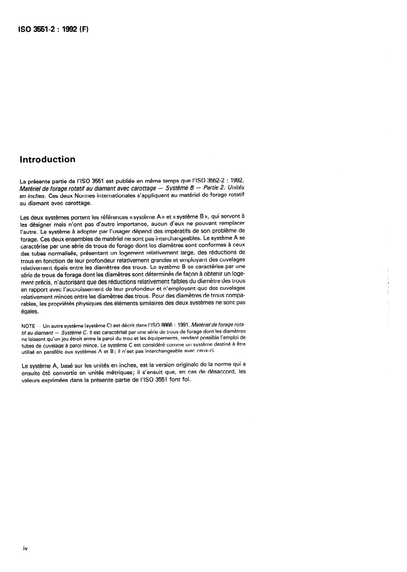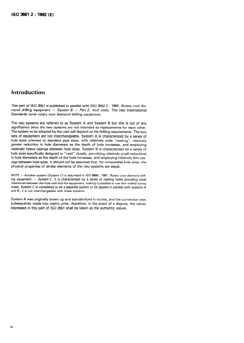 - ISO 3552:1992 - Rotary core diamond drilling equipment - System B (Part 2: Inch units) (published in parallel)