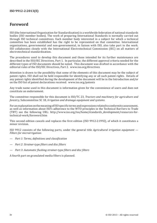ISO 9912-2:2013 is a standard published by the International Organization for Standardization (ISO). Its full title is "Agricultural irrigation equipment - Filters for microirrigation - Part 2: Strainer-type filters and disc filters". This standard covers: ISO 9912-2:2013 specifies general construction requirements and test methods for strainer filters and disc filters intended for operation in agricultural irrigation systems. It does not cover the aspects of filtration ability, efficiency and capacity (like quality of filtered water or time of operation before a filter becomes entirely clogged), nor does it deal with structural requirements or tests of automatic flushing mechanism filters that are covered by ISO 9912-3.