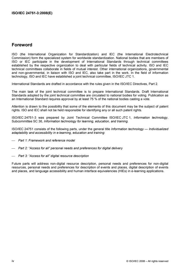 ISO/IEC 24751-3:2008 is a standard published by the International Organization for Standardization (ISO). Its full title is "Information technology - Individualized adaptability and accessibility in e-learning, education and training - Part 3: "Access for all" digital resource description". This standard covers: ISO/IEC 24751-3:2008 provides a common language for describing digital learning resources to facilitate matching of those resources to learners' accessibility needs and preferences (as defined in ISO/IEC 24751-2). This description is one side of a pair of descriptions used in matching user needs and preferences with education delivery (as described in ISO/IEC 24751-1). ISO/IEC 24751-3:2008 discusses the basic principles adhered to in developing this model for describing digital learning resources. It explains: the assumptions made in developing ISO/IEC 24751-3:2008, the notion of an original and adapted resource, the major categories of metadata for original and adapted resources, the notion of an access mode for a resource, what is meant by adaptability, and the importance of interoperability and the role played by consistent implementation in interoperability. It contains the information model for ISO/IEC 24751-3, including the attribute, allowed occurrence and datatype of each element. It defines and describes how the terms in the information model should be used, and explains how ISO/IEC 24751-3:2008 can be extended. It discusses conformance to ISO/IEC 24751-3. Conformance is dependent on the role played by the conformant technology. Conformance requirements for both education delivery applications, resources and metadata authoring tools are explained. ISO/IEC 24751-3:2008 provides a consolidated list of all the terms defined in ISO/IEC 24751-3:2008, sorted in French alphabetical order, the ISO French language equivalent terms and definitions, and the codes representing the gender of the French terms. The vocabulary codes, values and associated rules of application are defined. An informative list of recommended default values for the learner preferences and needs is provided. It lists existing bindings of the IMS Access for All Metadata Specification Version 1 (ACCMD) that serves as the reference specification for ISO/IEC 24751-3:2008. It describes information scenarios for applying ISO/IEC 24751-3:2008 and gives informative implementation examples. Use of ISO/IEC 24751-3:2008 will assist in matching individual learner needs in a computer-mediated learning environment with the necessary user interface and resources needed to meet those needs.