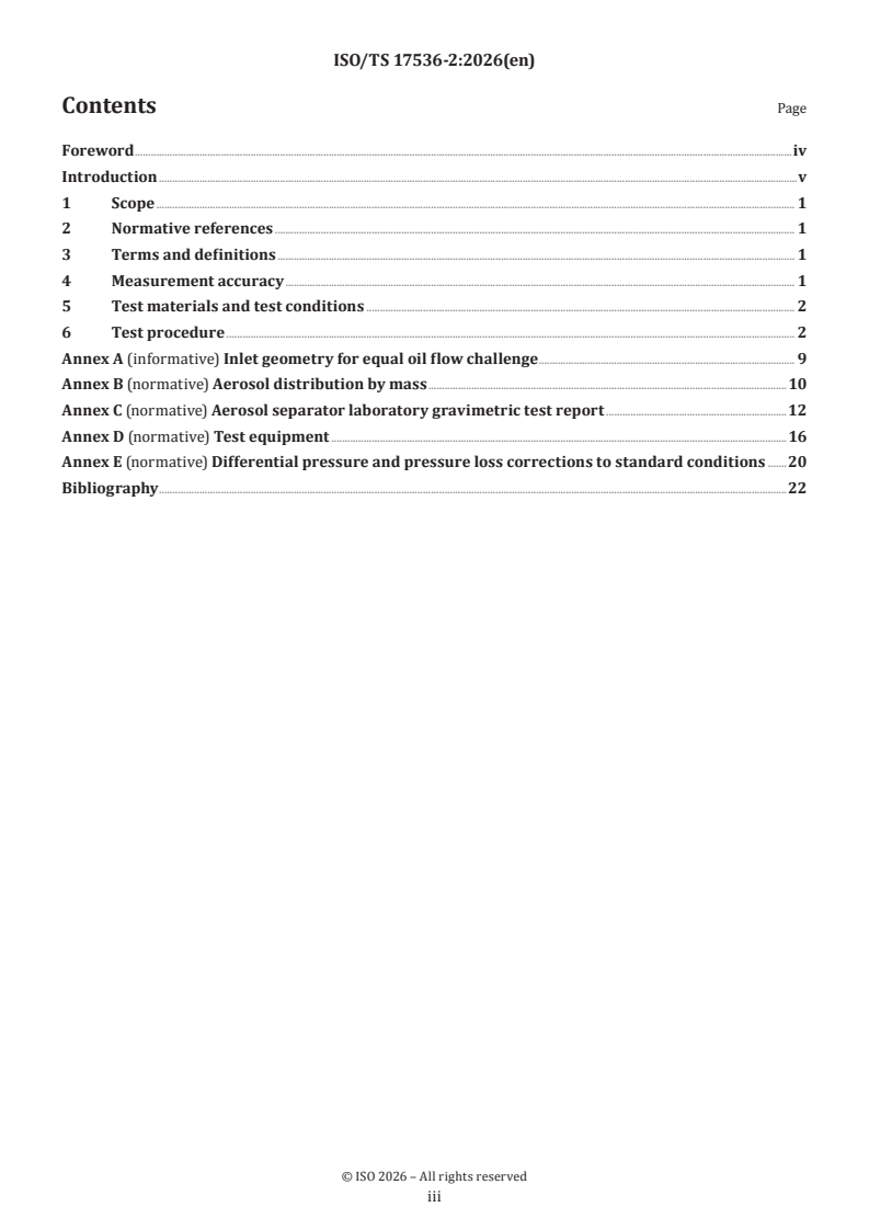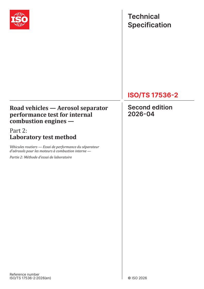 ISO/TS 17536-2:2026 is a technical specification published by the International Organization for Standardization (ISO). Its full title is "Road vehicles — Aerosol separator performance test for internal combustion engines — Part 2: Laboratory test method". This standard covers: This document defines standardized and repeatable test procedures for the evaluation of blowby oil aerosol separators and filtering devices and specifies laboratory gravimetric separation efficiency and system pressure tests in both open and closed crankcase ventilation systems. This document has a limitation of 0 % to 99 % for aerosol gravimetric efficiency. NOTE Gravimetric efficiencies > 99 % can be difficult to measure due to long test durations and absolute filter weight measurements. Filter life is not evaluated in this document. This test method only applies to devices that have a defined tubular inlet, outlet and drain that can be connected to the test equipment. For devices that lack such connections, for example, one that is built into a valve cover, see Annex A.