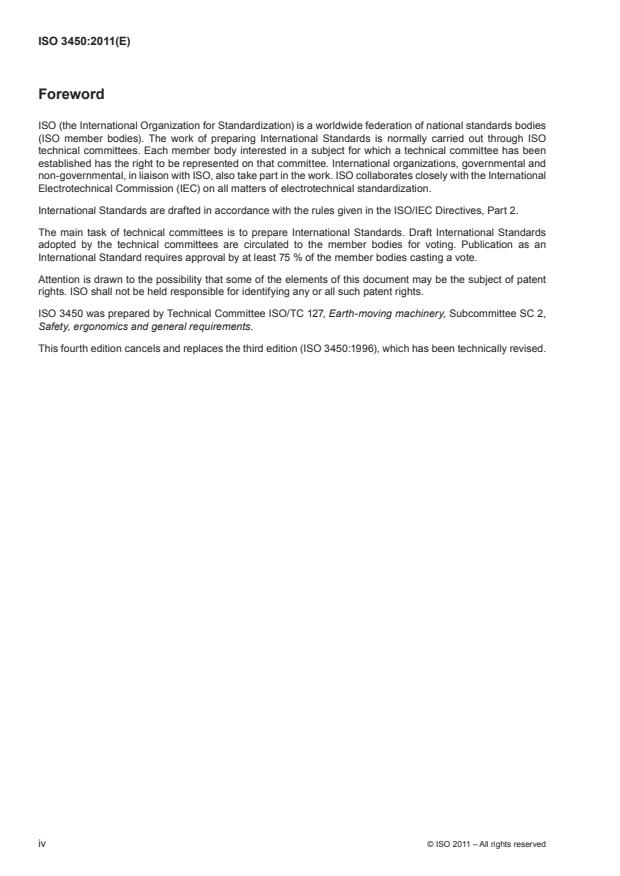 ISO 3450:2011 is a standard published by the International Organization for Standardization (ISO). Its full title is "Earth-moving machinery - Wheeled or high-speed rubber-tracked machines - Performance requirements and test procedures for brake systems". This standard covers: ISO 3450:2011 specifies minimum performance requirements and test procedures for the service, secondary and parking brake systems of wheeled and high-speed rubber-tracked earth-moving machines, for the uniform assessment of those brake systems. It is applicable to the following earth-moving machinery, operating on work sites or in mining, or travelling on public roads: self-propelled, rubber-tyred earth-moving machines, as defined in ISO 6165; self-propelled rollers and landfill compactors, as defined in ISO 6165 and ISO 8811; self-propelled scrapers, as defined in ISO 7133; remote-control machines, as defined in ISO 6165, wheeled or rubber-tracked; derivative earth-moving machines with rubber tyres; earth-moving machines with rubber tracks and a maximum machine speed greater than or equal to 20 km/h. It is not applicable to pedestrian-controlled earth-moving machinery (see ISO 17063) or crawler earth-moving machines with steel or rubber tracks that travel at less than 20 km/h (see ISO 10265). While purpose-built underground mining machines are not within the scope of ISO 3450:2011, its provisions can generally be applied to those machines with some braking performance modifications and additions, given in an annex.