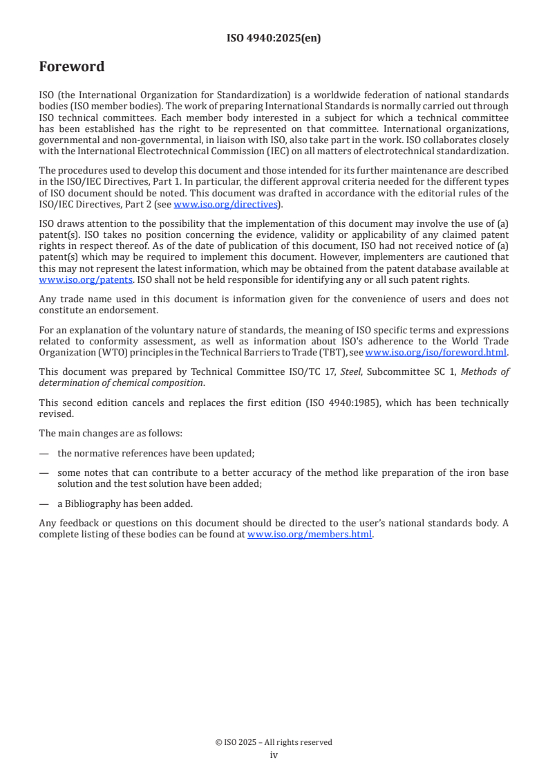 ISO 4940:2025 specifies a flame atomic absorption spectrometric (FAAS) method for the determination of nickel content in steel and cast iron. The method covers nickel mass fractions from 0.002% to 0.5% and defines sample preparation, reagents, instrument performance criteria, calibration and reporting requirements. This second edition updates references, adds guidance on solution preparation and a bibliography, and replaces ISO 4940:1985.