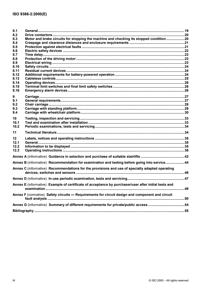 - Annexes: Annex F (normative) on safety circuits; informative annexes A–E and G provide purchaser guidance, testing recommendations and public/private access distinctions.