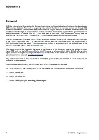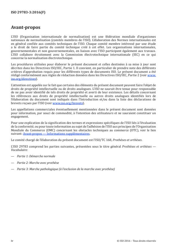 ISO 29783-3:2016 is a standard published by the International Organization for Standardization (ISO). Its full title is "Prosthetics and orthotics - Vocabulary - Part 3: Pathological gait (excluding prosthetic gait)". This standard covers: ISO 29783-3:2016 specifies a method of describing abnormal gait patterns resulting from pathology (excluding prosthetic gait) by identifying the deviations from the normal pattern of gait during each sub-phase of the gait cycle. The description of the deviations includes references to abnormal foot contact and abnormalities of joint motion.