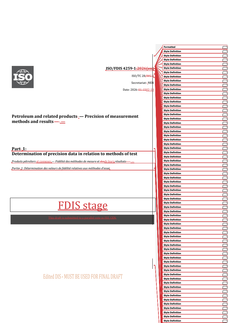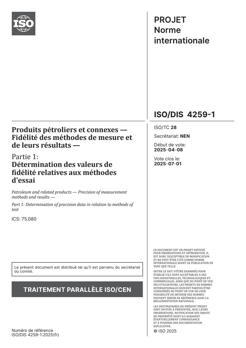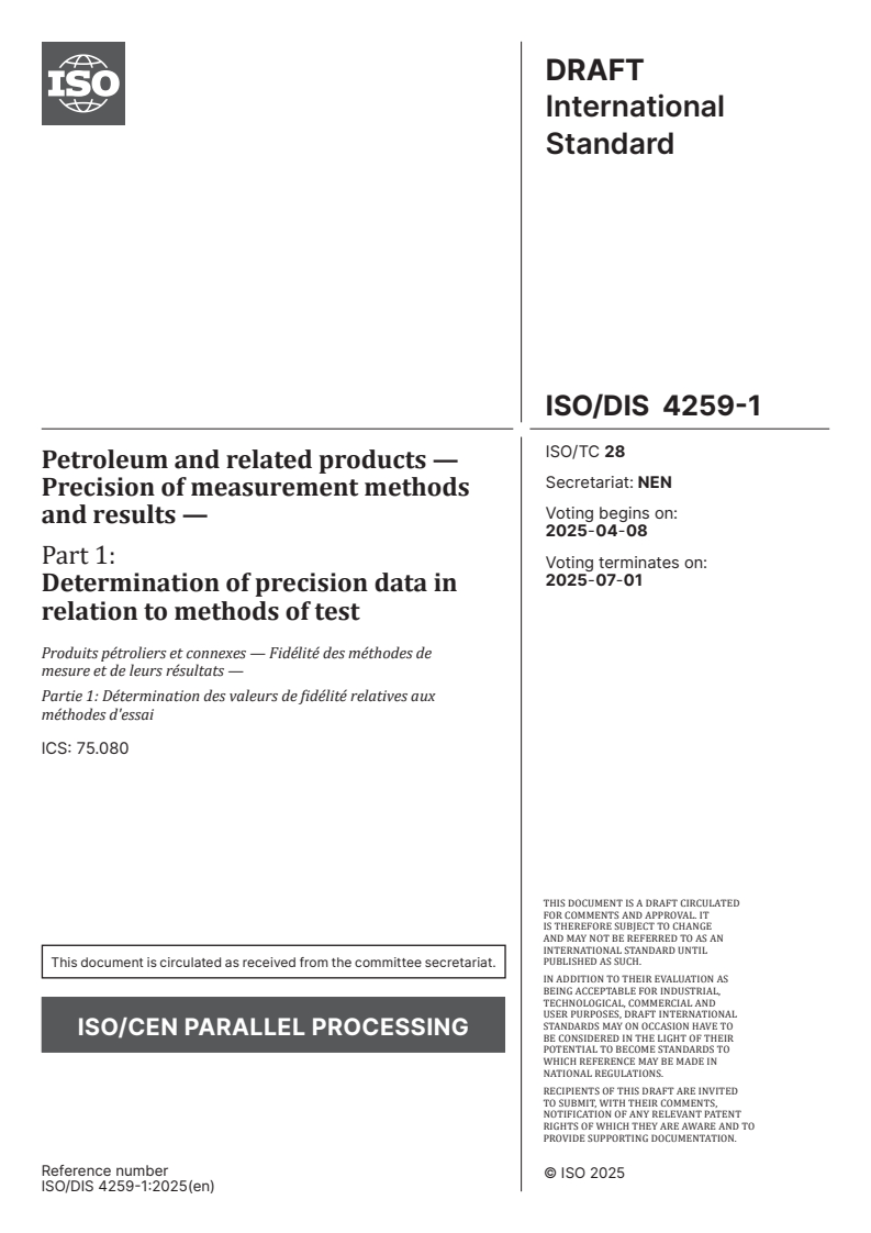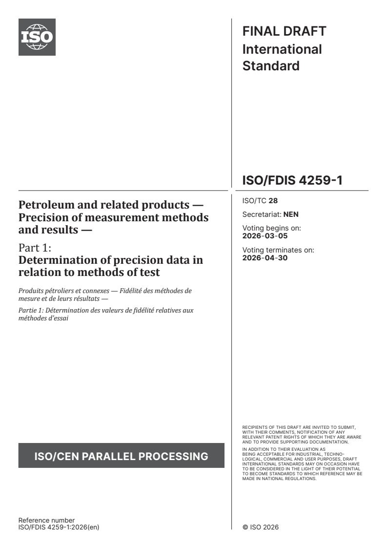 ISO/FDIS 4259-1 - Petroleum and related products — Precision of measurement methods and results — Part 1: Determination of precision data in relation to methods of test/11/2025