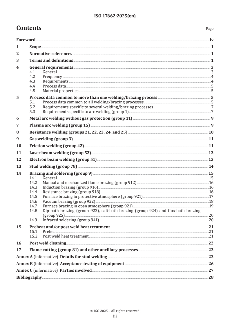 - Process-specific requirements: detailed sections address different welding/brazing groups such as arc welding, resistance welding, plasma, laser and electron beam welding, brazing and soldering, stud and friction welding, pre/post‑weld heat treatment, flame cutting and ancillary processes.