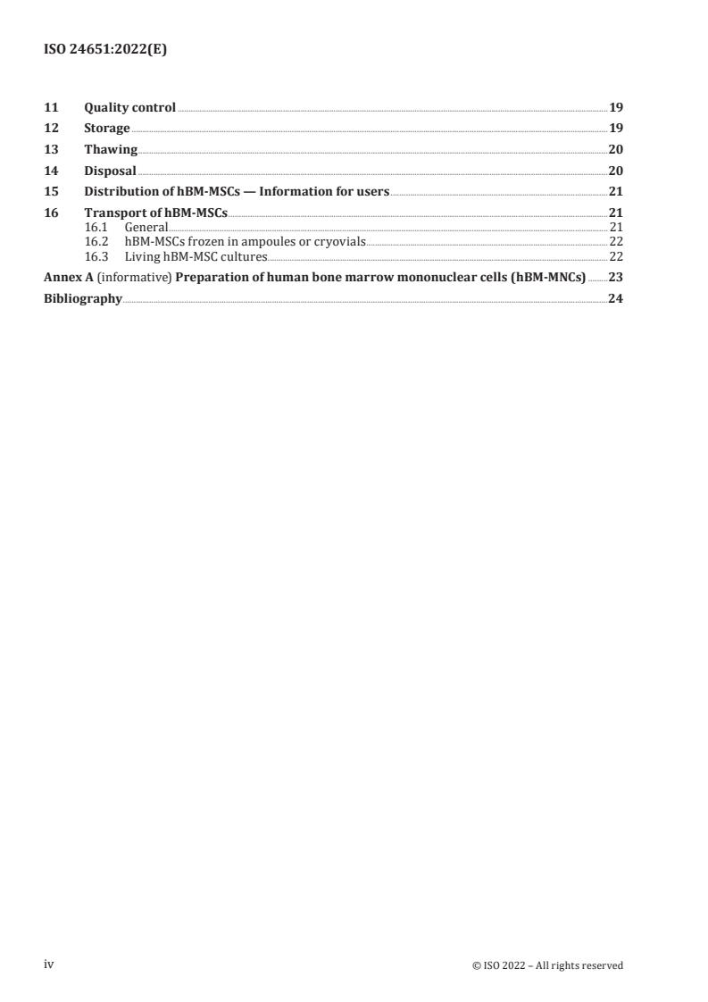 ISO 24651:2022 is a standard published by the International Organization for Standardization (ISO). Its full title is "Biotechnology - Biobanking - Requirements for human mesenchymal stromal cells derived from bone marrow". This standard covers: This document specifies requirements for the biobanking of human mesenchymal stromal cells derived from bone marrow (hBM-MSCs), including the collection of bone marrow and associated data, isolation, culture, characterization, quality control, cryopreservation, storage, thawing, disposal, distribution and transport. This document is applicable to all organizations performing biobanking with hBM-MSCs used for research. This document does not apply to hBM-MSCs for the purpose of in vivo application in humans, cell therapy, clinical applications, tissue engineering or therapeutic use. NOTE International, national or regional regulations or requirements, or multiple of them, can also apply to specific topics covered in this document.
