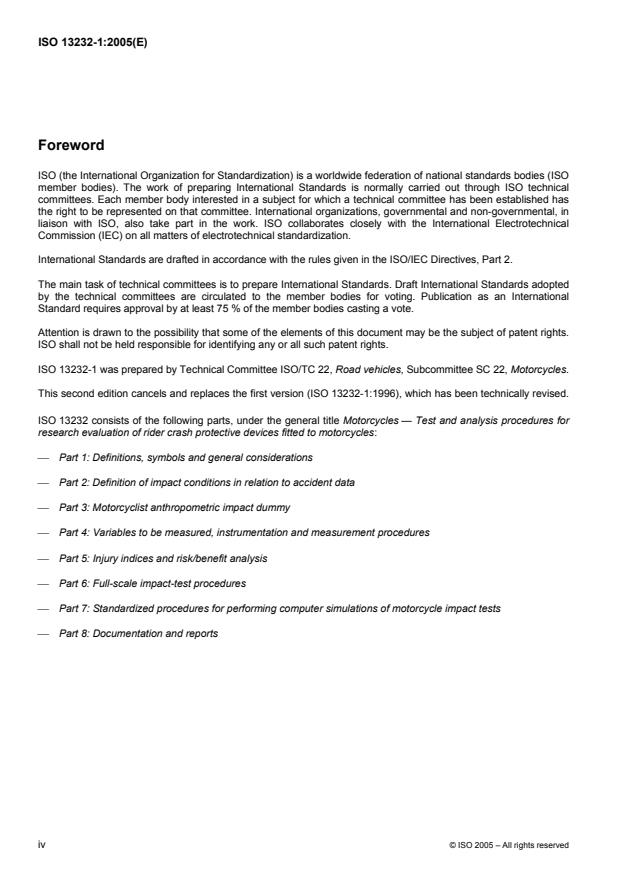 ISO 13232-1:2005 provides the definitions, abbreviations, symbols and other general considerations used in all parts of ISO 13232, which specifies the minimum requirements for research into the feasibility of protective devices fitted to motorcycles, which are intended to protect the rider in the event of a collision. ISO 13232 is applicable to impact tests involving: two-wheeled motorcycles; the specified type of opposing vehicle; either a stationary and a moving vehicle or two moving vehicles; for any moving vehicle, a steady speed and straight-line motion immediately prior to impact; one-helmeted dummy in a normal seating position on an upright motorcycle; the measurement of the potential for specified types of injury by body region; and evaluation of the results of paired impact tests (i.e. comparisons between motorcycles fitted and not fitted with the proposed devices). ISO 13232 does not apply to testing for regulatory or legislative purposes.