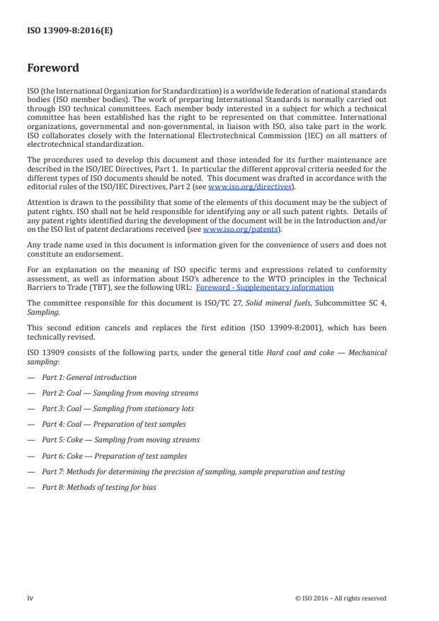 ISO 13909-8:2016 is a standard published by the International Organization for Standardization (ISO). Its full title is "Hard coal and coke - Mechanical sampling - Part 8: Methods of testing for bias". This standard covers: ISO 13909-8:2016 sets out principles and procedures for testing the bias of test samples of hard coals or cokes, taken in accordance with ISO 13909: 2016 (all parts). NOTE In the text, the term "fuel" is used where both coal and coke would be applicable in the context and either "coal" or "coke" where only one is applicable.