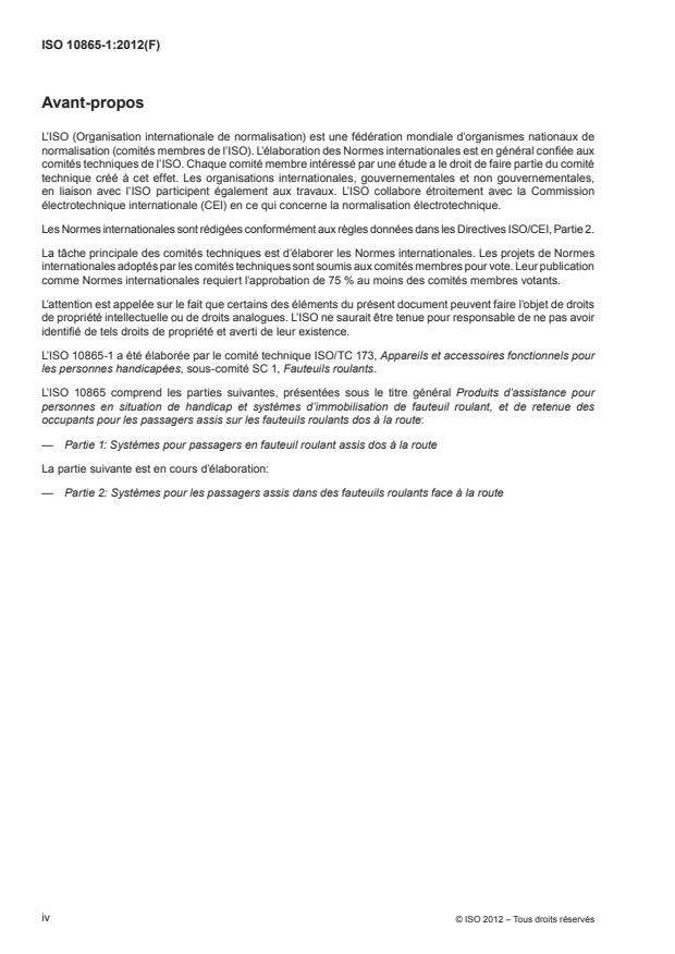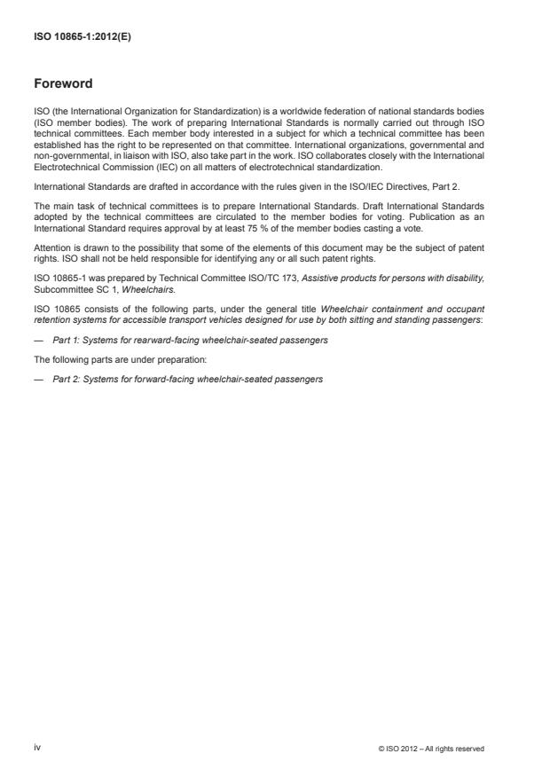 ISO 10865-1:2012 is a standard published by the International Organization for Standardization (ISO). Its full title is "Wheelchair containment and occupant retention systems for accessible transport vehicles designed for use by both sitting and standing passengers - Part 1: Systems for rearward-facing wheelchair-seated passengers". This standard covers: ISO 10865-1:2012 is applicable to wheelchair passenger spaces (RF‑WPSs) intended for use by rearward-facing wheelchair-seated occupants, with a body mass greater than 22 kg, when travelling in accessible transport vehicles. It is applicable to systems for use in vehicles used mainly on fixed route services when operated under normal and emergency driving conditions, where passengers are allowed to travel both sitting and standing. ISO 10865-1:2012 specifies design and performance requirements and associated test methods, requirements for manufacturer instructions and warnings to installers and users, requirements for product labelling and disclosure of test information. The primary purpose of ISO 10865-1:2012 is to limit those movements of a rearward-facing wheelchair, including scooters with three or more wheels, that might result in hazardous contact with the vehicle interior or injury to other passengers.