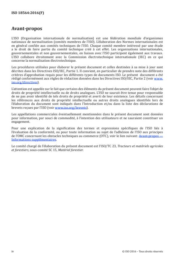ISO 18564:2016 is a standard published by the International Organization for Standardization (ISO). Its full title is "Machinery for forestry - Noise test code". This standard covers: ISO 18564:2016 specifies all the information necessary for carrying out efficiently and under standardised conditions the noise emission values of self-propelled forestry machinery. It is applicable to fellers, bunchers, delimbers, forwarders, log loaders, skidders, processors, harvesters, mulchers and multi-function versions of these machine types, as defined in ISO 6814. Noise emission characteristics include A-weighted emission sound pressure values at the operator's station and the A-weighted sound power value. The determination of these quantities is necessary for the following: - manufacturers to declare the noise emitted; - comparing the noise emitted by machines in the family concerned; - purposes of noise control at the source at the design stage. NOTE For low-noise design, noise emission values in frequency bands are useful and the basic International Standards ISO 3744 and ISO 11201 can be used for determining noise emission quantities in frequency bands.