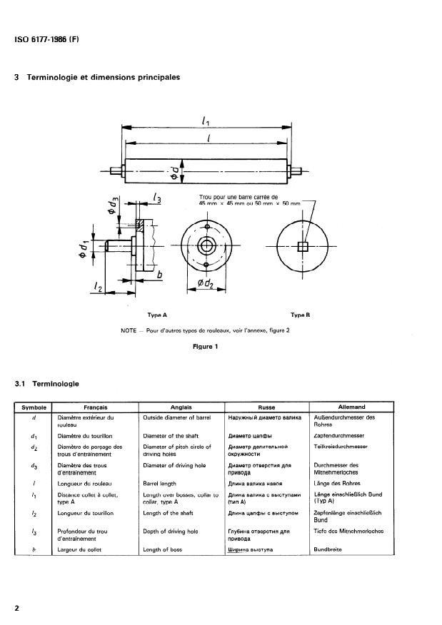 - Designation format: specifies the sequence of information required in a roller designation: name, ISO reference, roller type (e.g., Type A, Type B), outside diameter, roller length, and collar-to-collar distance (type A). Example: “Rouleau magasin ISO 6177 - A - 100 x 2 000 x 2 010”.