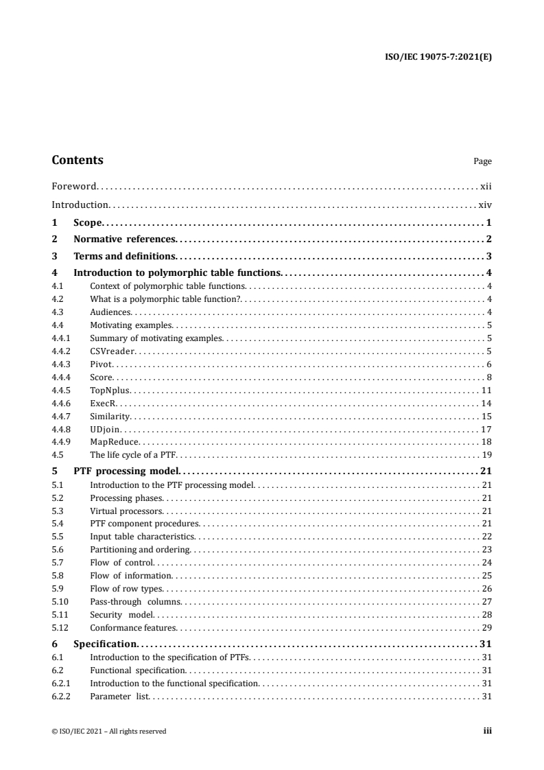 ISO/IEC 19075-7:2021 is a standard published by the International Organization for Standardization (ISO). Its full title is "Information technology - Guidance for the use of database language SQL - Part 7: Polymorphic table functions". This standard covers: This document describes the definition and use of polymorphic table functions in SQL. The Report discusses the following features of the SQL Language: - The processing model of polymorphic table functions in the context of SQL. - The creation and maintenance of polymorphic table functions. - Issues related to methods of implementing polymorphic table functions. - How polymorphic table functions are invoked by application programs. - Issues concerning compilation, optimization, and execution of polymorphic table functions.