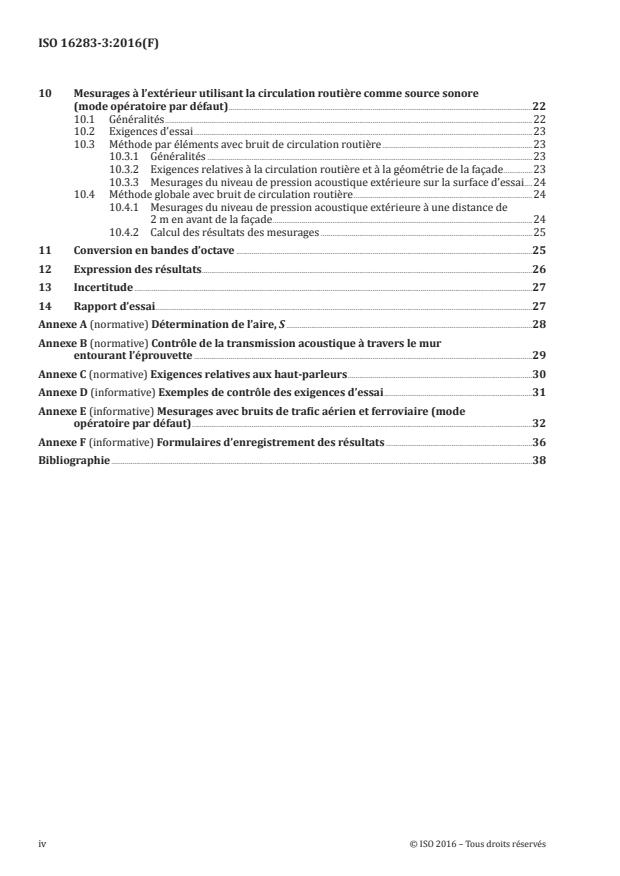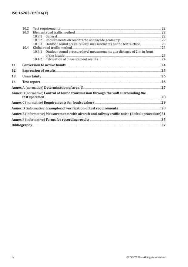 ISO 16283-3:2016는 소리 압력 측정을 이용하여 건물 파사드 요소(element methods) 및 전체 파사드(global methods)의 공기중 소리 차단력을 결정하는 절차를 명시합니다. 이 절차들은 10 m3에서 250 m3의 범위에 있는 방 내부적으로 50 Hz ~ 5,000 Hz의 주파수 범위에서 응용됩니다. 이러한 실험 결과는 가구가 있는지 여부에 관계 없이 소리가 산란되는지 여부와 관계없이 가구 미완성 또는 완성된 방의 공기중 소리 차단력을 양적, 평가 및 비교하는 데 사용될 수 있습니다. 측정된 공기중 소리 차단력은 주파수에 따라 달라지며, 이 절차는 ISO 717-1의 등급 결정 방법을 사용하여 음향 성능을 특징화하는 단일 숫자로 변환될 수 있습니다.