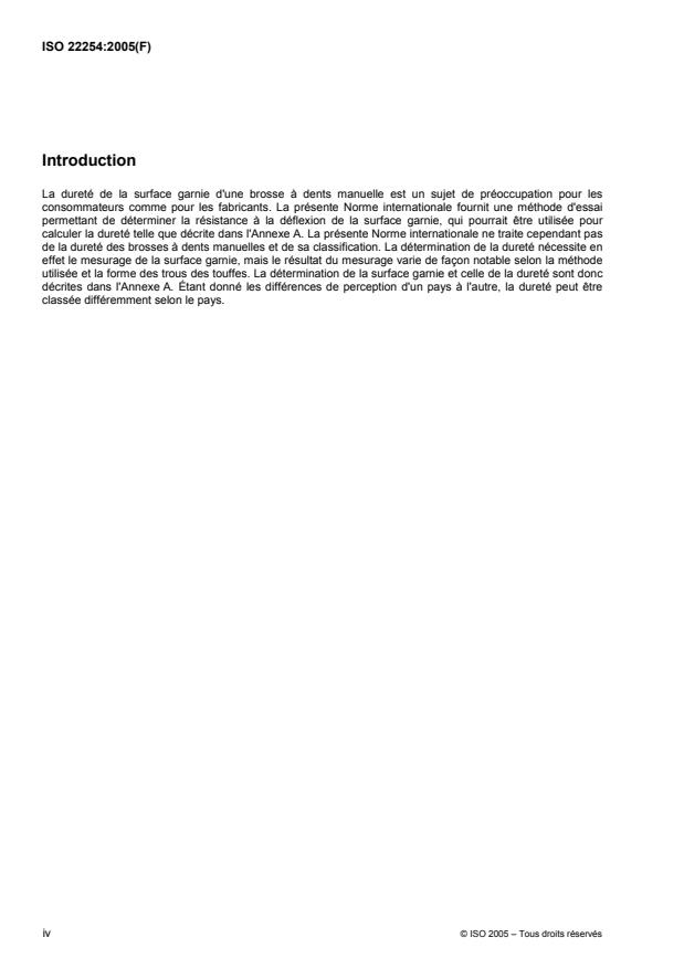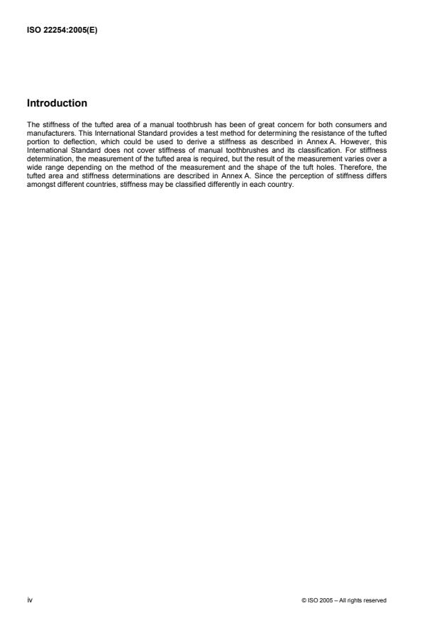 ISO 22254:2005 specifies a laboratory test method to determine the resistance of the tufted portion of manual toothbrushes to deflection. It applies to conventional flat-trim manual toothbrush designs and provides a reproducible way to measure how much force the tufted area resists when deflected. The standard clarifies that measured resistance may not match consumer perceptions of bristle stiffness.