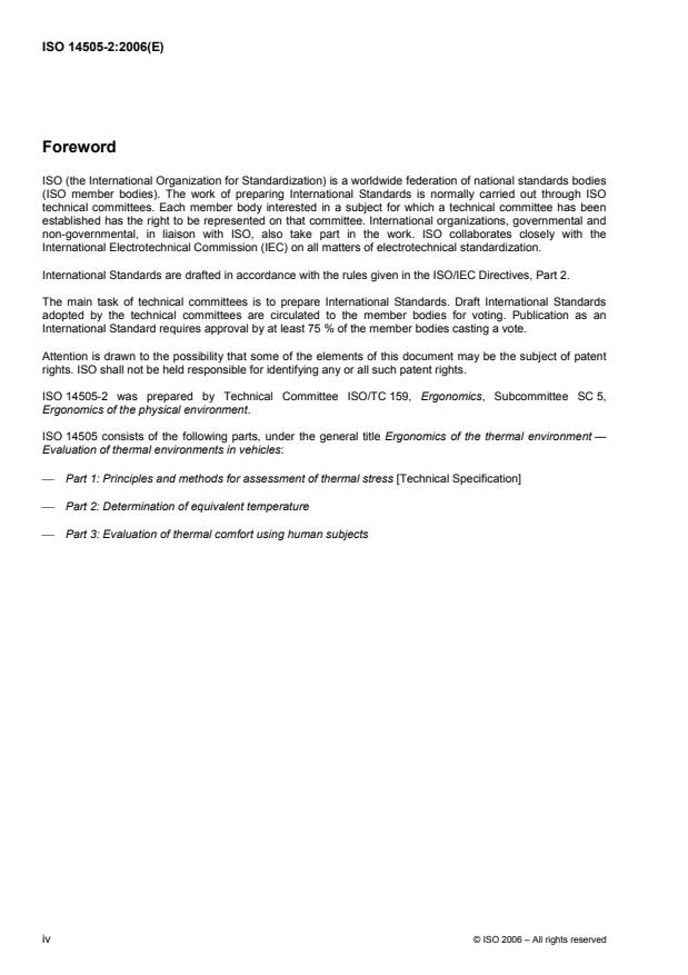 ISO 14505-2:2006 is a standard published by the International Organization for Standardization (ISO). Its full title is "Ergonomics of the thermal environment - Evaluation of thermal environments in vehicles - Part 2: Determination of equivalent temperature". This standard covers: ISO 14505-2:2006 provides guidelines for the assessment of the thermal conditions inside a vehicle compartment. It can also be applied to other confined spaces with asymmetric climatic conditions. It is primarily intended for assessment of thermal conditions, when deviations from thermal neutrality are relatively small. Appropriate methodology as given in ISO 14505-2:2006 can be chosen for inclusion in specific performance standards for testing of HVAC-systems for vehicles and similar confined spaces.