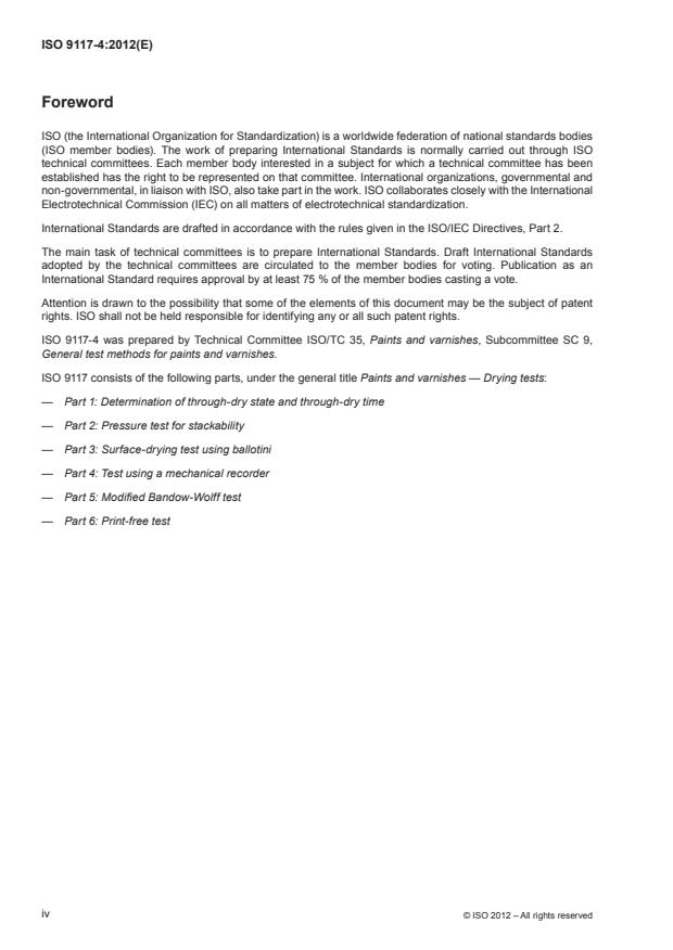 ISO 9117-4:2012 is a standard published by the International Organization for Standardization (ISO). Its full title is "Paints and varnishes - Drying tests - Part 4: Test using a mechanical recorder". This standard covers: ISO 9117-4:2012 specifies a test for determining the times taken to reach various stages of drying of organic coatings, using a mechanical straight-line or circular drying-time recorder. The use of a mechanical recorder is valuable in comparing the drying behaviour of coatings of the same generic type, when one coating might form a gel at a faster rate than another or might resist scratching better than another. The test is intended to simulate the conditions which exist when painted articles are stacked upon each other.