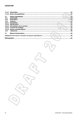 ISO 669:2016 is a standard published by the International Organization for Standardization (ISO). Its full title is "Resistance welding - Resistance welding equipment - Mechanical and electrical requirements". This standard covers: ISO 669:2016 defines and specifies certain identified electrical and mechanical characteristics of equipment used for - resistance spot welding, - projection welding, - resistance seam welding, - upset welding[1], and ? flash welding[2]. ISO 669:2016 specifies the information to be given in equipment specifications and the test methods to be used for measuring those characteristics. Not all requirements apply to all types of equipment. The following types of power sources are included: - single phase with alternating welding current; - single phase with rectified welding current by rectification of the output of the welding transformer; - single phase with inverter welding transformer; - three phase with rectified welding current by rectification of the output of the welding transformer; - three phase with a current rectification in the input of the welding transformer (sometimes called frequency convertor); - three phase with inverter welding transformers. ISO 669:2016 Standard does not apply to welding transformers that are separate from the equipment. NOTE Safety requirements for resistance welding equipment are covered by IEC 62135?1. [1] Often referred to by the non-preferred term, butt welding. [2] Often referred to by the non-preferred term, flash butt welding.
