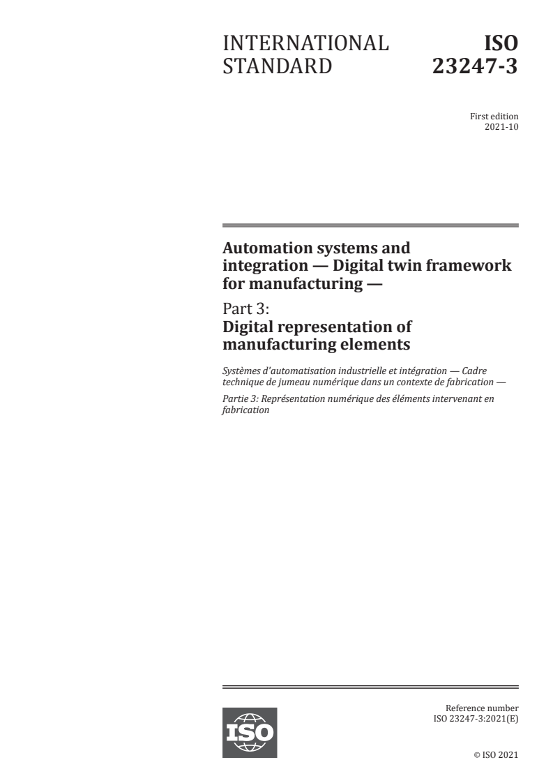 ISO 23247-3:2021 is a standard published by the International Organization for Standardization (ISO). Its full title is "Automation systems and integration - Digital twin framework for manufacturing - Part 3: Digital representation of manufacturing elements". This standard covers: This document provides a list of basic information attributes for the OMEs: - examples of information attributes are given; - standards that can define these information attributes are discussed in Annex A.