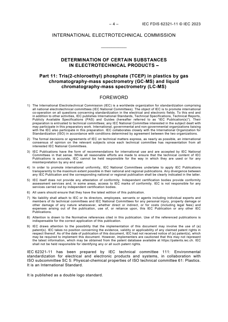 IEC/FDIS 62321-11 - Determination of certain substances in electrotechnical products — Part 11: Tris (2-chloroethyl) phosphate (TCEP) in plastics by gas chromatography-mass spectrometry (GC-MS) and liquid chromatography-mass spectrometry (LC-MS) Released:5. 10. 2023