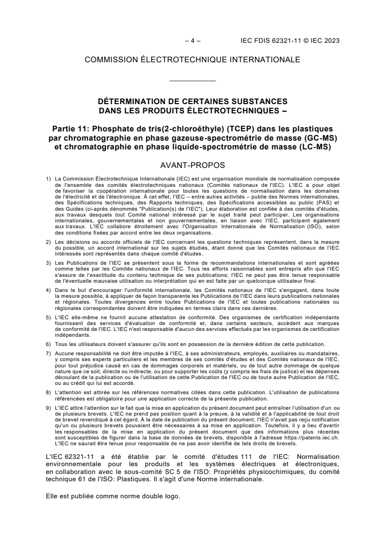IEC/FDIS 62321-11 - Détermination de certaines substances dans les produits électrotechniques — Partie 11: Phosphate de tris (2-chloroéthyle) (TCEP) dans les plastiques par chromatographie en phase gazeuse-spectrométrie de masse (GC-MS) et chromatographie liquide-spectrométrie de masse (LC-MS) Released:6. 10. 2023
