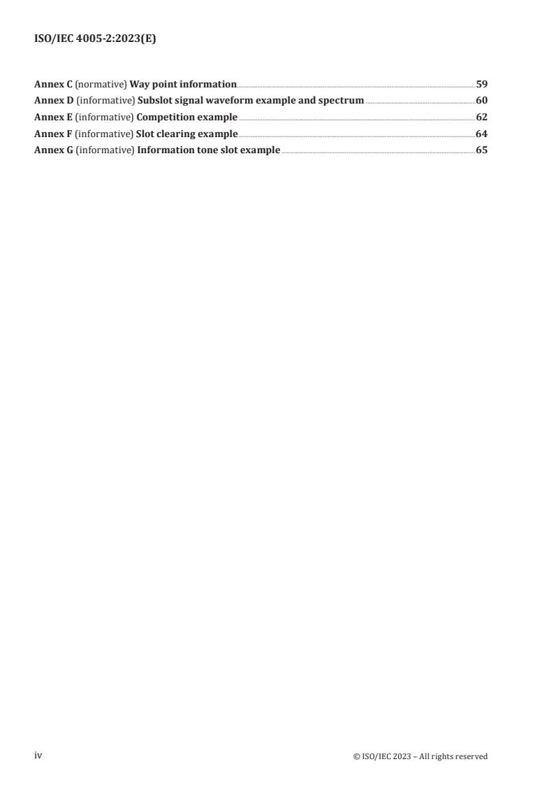 The published table of contents and annexes indicate normative elements (e.g., turbo interleaver tables) and informative examples for competition, slot clearing and tone-slot operation.