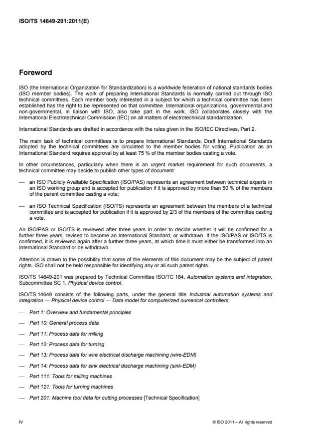 ISO/TS 14649-201:2011 is a technical specification published by the International Organization for Standardization (ISO). Its full title is "Industrial automation systems and integration - Physical device control - Data model for computerized numerical controllers - Part 201: Machine tool data for cutting processes". This standard covers: ISO/TS 14649-201:2011 specifies the technology-specific machine tool description data elements needed as process data for manufacturing and machine characteristics. The machine tool descriptions covered in this schema are, initially, milling machines, machining centres, turning machines and multi-tasking machines. ISO/TS 14649-201:2011 is not intended to replace existing machine tool description standards, but to cover the specific needs of manufacturing resource description for manufacturing needs in the technologies described in ISO 14649. Examples of manufacturing applications of this model are: part programming for CNC machining; process planning; a simulation of machining processes; analysis of expected machining time and machine tool energy use; a description of new machine tools for manufacturing evaluation and/or controller development. The schema specified in ISO/TS 14649-201:2011 does not include representations, executable objects and base classes that are common for all technologies. These are referenced from the generic resources of ISO 10303 and from ISO 14649-10.