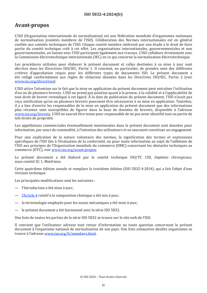 Cette quatrième édition annule et remplace la troisième édition (ISO 5832-4:2014), qui a fait l’objet d’une