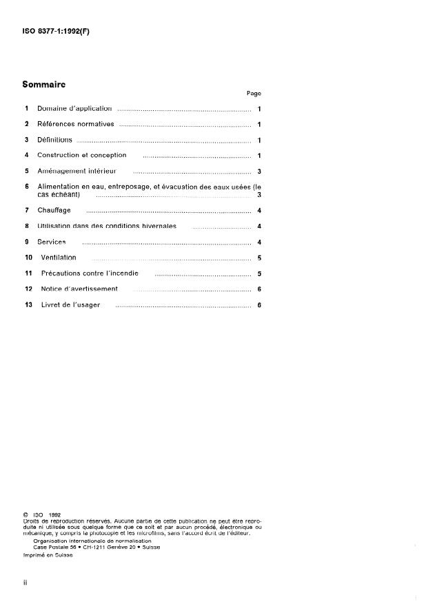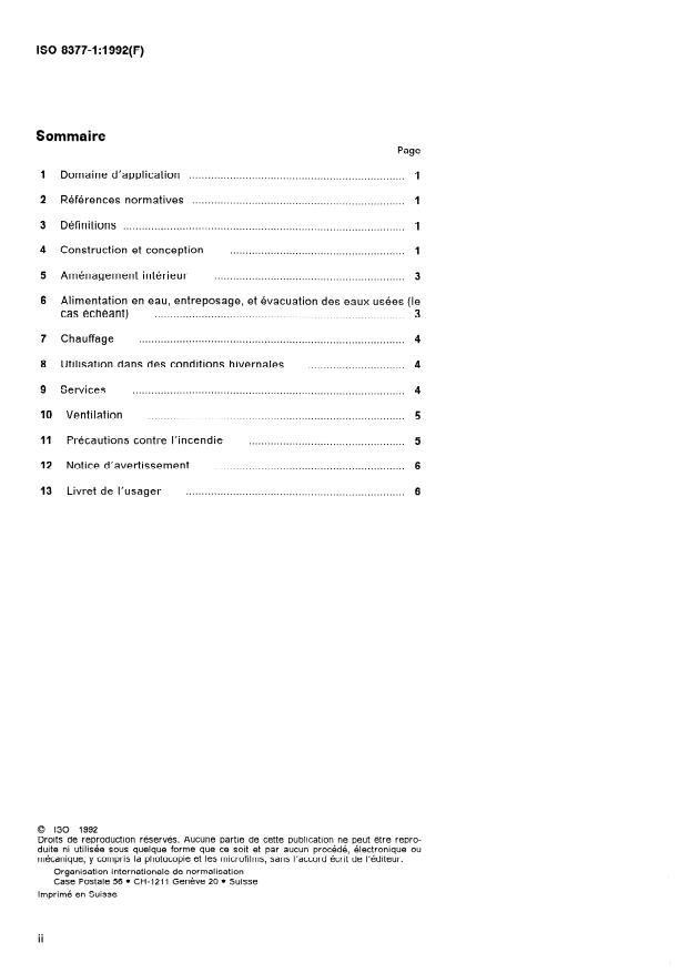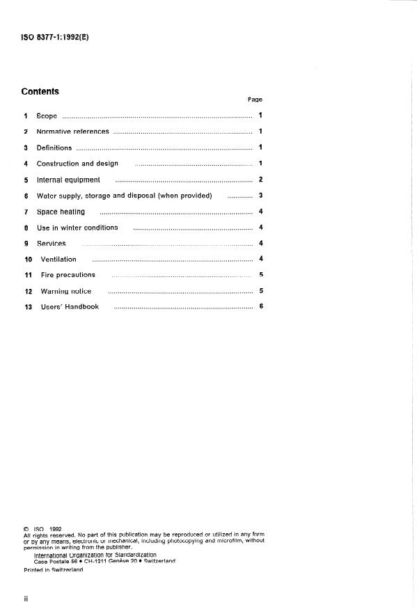 ISO 8377-1:1992 is a standard published by the International Organization for Standardization (ISO). Its full title is "Leisure accommodation vehicles — Motor caravans — Part 1: Habitation requirements". This standard covers: Specifies certain functional requirements for the habitation aspects and certain safety requirements for: construction and design; internal equipment; water supply, storage and disposal (when provided); space heating; use in winter conditions; services; ventilation; fire precautions; warning notice; users' handbook.