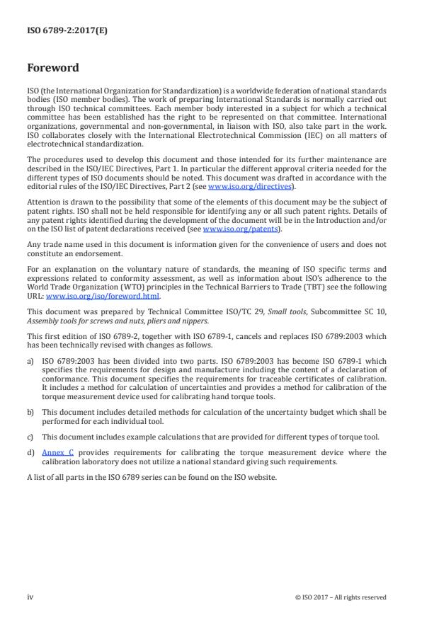 ISO 6789-2:2017 is a standard published by the International Organization for Standardization (ISO). Its full title is "Assembly tools for screws and nuts - Hand torque tools - Part 2: Requirements for calibration and determination of measurement uncertainty". This standard covers: ISO 6789-2:2017 specifies the method for the calibration of hand torque tools and describes the method of calculation of measurement uncertainties for the calibration. ISO 6789-2:2017 specifies the minimum requirements for the calibration of the torque measurement device where the relative measurement uncertainty interval, W´md, is not already provided by a traceable calibration certificate. ISO 6789 is applicable for the step by step (static) and continuous (quasi-static) calibration of torque measurement devices, the torque of which is defined by measuring of the elastic form change of a deformable body or a measured variable which is in proportion to the torque. ISO 6789-2:2017 applies to hand torque tools which are classified as indicating torque tools (Type I) and setting torque tools (Type II). NOTE Hand torque tools covered by this document are the ones identified in ISO 1703:2005 by reference numbers 6 1 00 11 0, 6 1 00 11 1 and 6 1 00 12 0, 6 1 00 12 1 and 6 1 00 14 0, 6 1 00 15 0. ISO 1703 is currently under revision. In the next edition, torque tools will be moved to an own clause, and with this change the reference numbers will also change and additional reference numbers will be added.