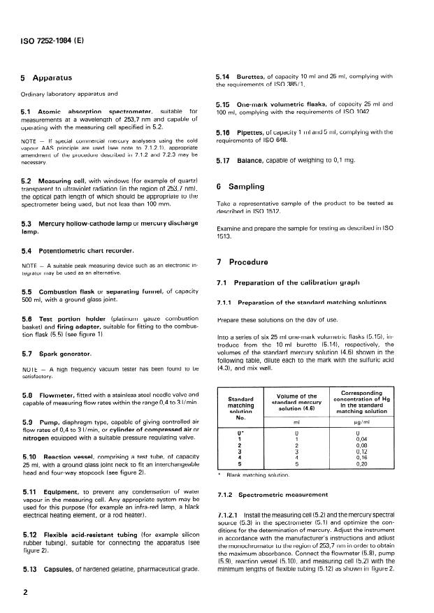 ISO 7252:1984 is a standard published by the International Organization for Standardization (ISO). Its full title is "Paints and varnishes - Determination of total mercury - Flameless atomic absorption spectrometric method". This standard covers: The reference method described is applicable to products having total mercury contents in the range of about 0.01 % (m/m) to 0.5 % (m/m). May also be extended to products with a total content of more than 0.5 % (m/m). The principle of the method consists in the combustion of the test portion with oxygen in an enclosed system. Reduction of the mercury(II) compounds contained in the resulting solution to elementary mercury. Entrainment of the metal in a gas stream at ambient temperature and determination as the monoatomic vapour by cold vapour atomic absorption spectrometry at a wavelength in the region of 253.7 nm.